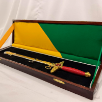 - Bainha em aço inox, detalhes da bainha, parafusos do punho, cabeçote e cruzeta banhados a ouro