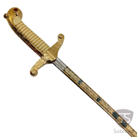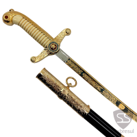- Lâmina de aço inoxidável, forjado, temperada, adamascada, banhada a ouro.